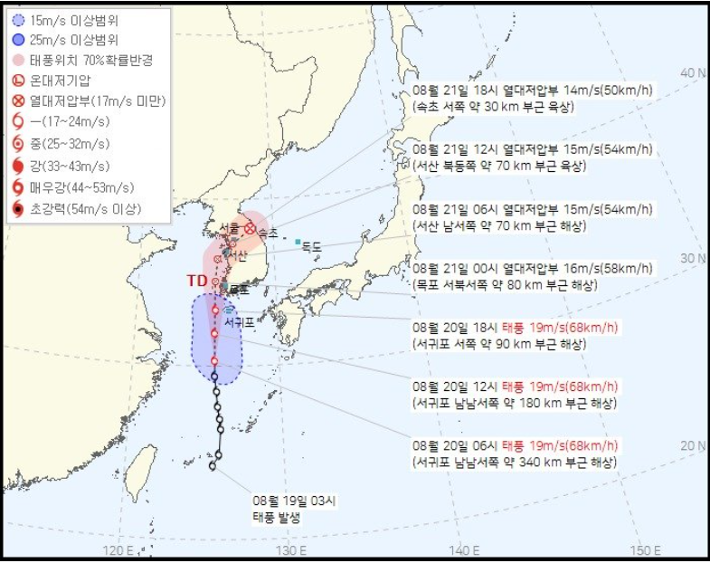 기상청에 따르면 태풍은 20일 정오께 서귀포 남남서쪽 부근 해상을, 오후 6시께은 서귀포 서쪽을 최대풍속 19㎧, 강풍반경 150∼170㎞의 규모로 지날 것으로 관측되며, 21일 자정께 목포 서북서쪽 부근 해상에서 열대저압부로 약화할 것으로 예상됩니다.