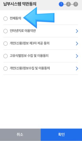 - 지방세외시스템에 부과정보 등록 완료 확인 후 납부시스템 약관을 전체 동의합니다.