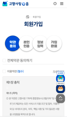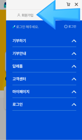 우측상단 메뉴 버튼을 누르시고 회원가입을 클릭한 후 약관에 동의 후 회원가입을 완료합니다.