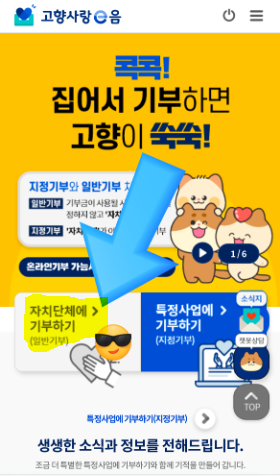 - 고향사랑e음 메인 화면 좌측하단의 기부 방법을 선택합니다. 자치단체에 기부 또는 특정사업에 기부 2가지 중 선택합니다.
