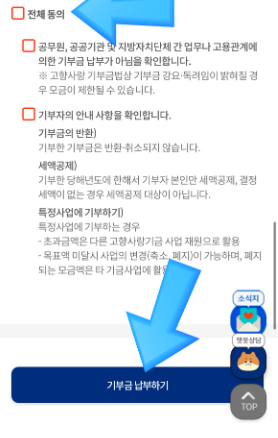 - 동의 사항 전체 동의 후 하단의 기부금 납부하기 버튼을 클릭합니다.
