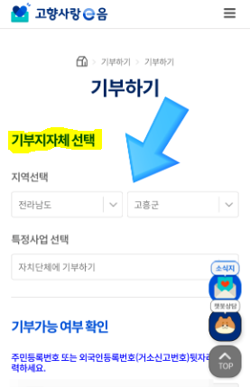 - 본인 거주 이외의 기부자치단체 지역을선택합니다.