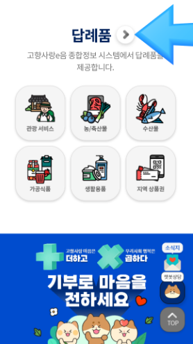 - 답례품 버튼을 클릭하면 농축산물 항목을 확인할 수 있습니다.