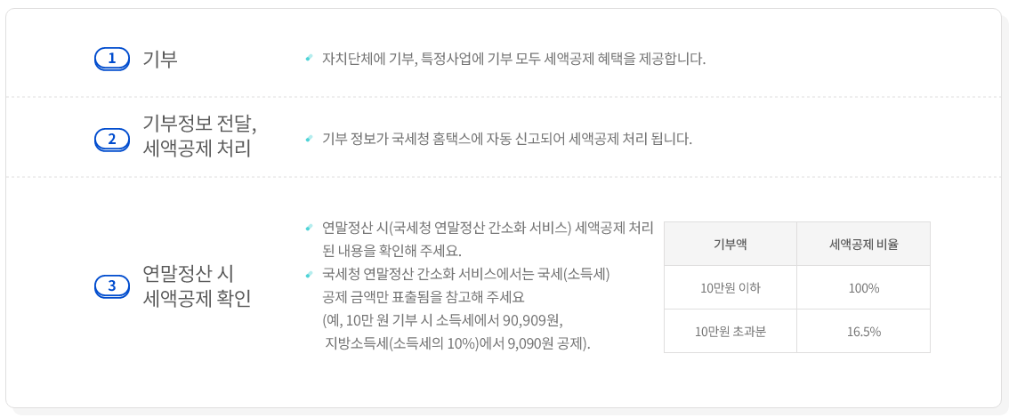 - 기부 금액에 대해 일정 부분 세액 공제를 받을 수 있음