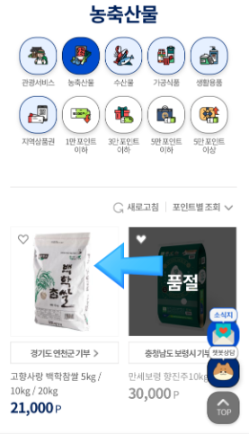 답례품 메뉴에서 포인트로 결제 가능한 지역 특산물을 골라 바로 선택해주시면 됩니다.