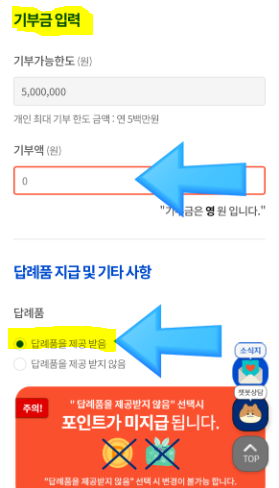 - '답례품을 제공받음' 을 선택해야 하며, 제공받지않음을 선택 시 포인트가 제공되지 않습니다.