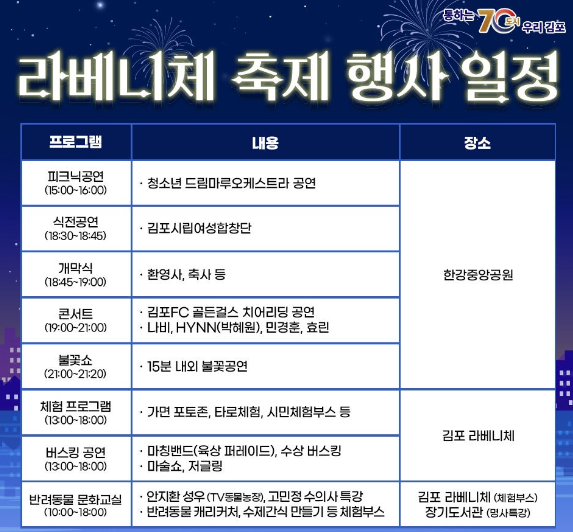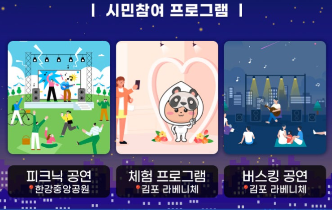 - 장소 : 김포한강중앙공원(메인공연) / 라베니체일원(체험 프로그램)