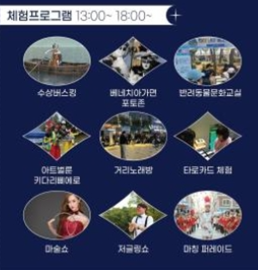 - 버스킹 공연 : 13:00~18:00 마칭밴드(육상 퍼레이드), 수상 버스킹, 마술쇼, 저글링