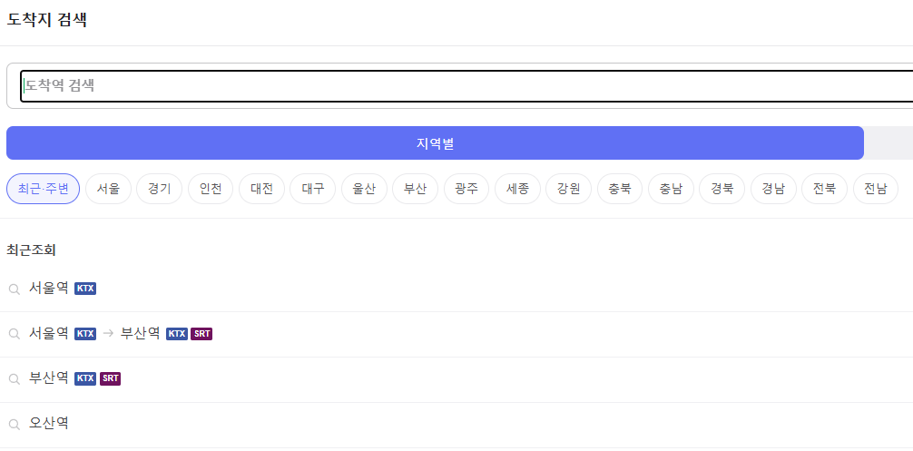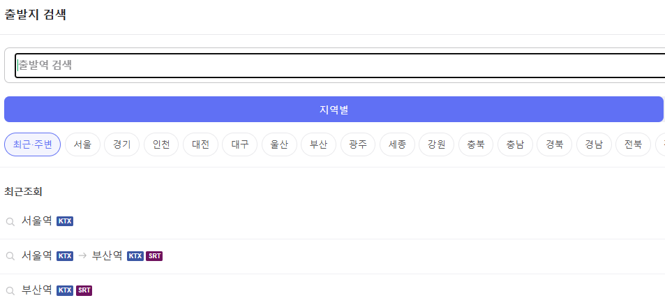 출발지 검색란 하단의 도시를 클릭한 후 아래의 출발역을 선택합니다.