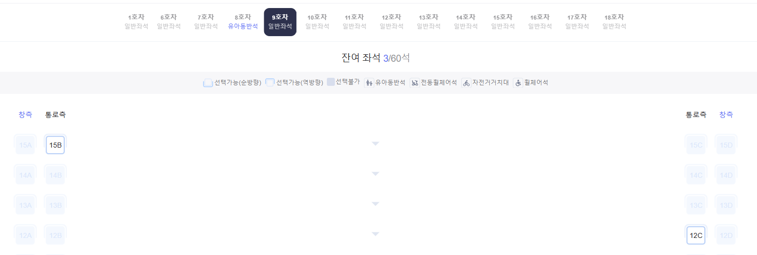 이용할 시간대 기차의 '호차'를 선택한 후 좌석을 선택합니다.