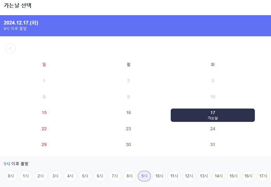 가는날의 시간을 ' O 시 이후'로 임의 선택합니다.