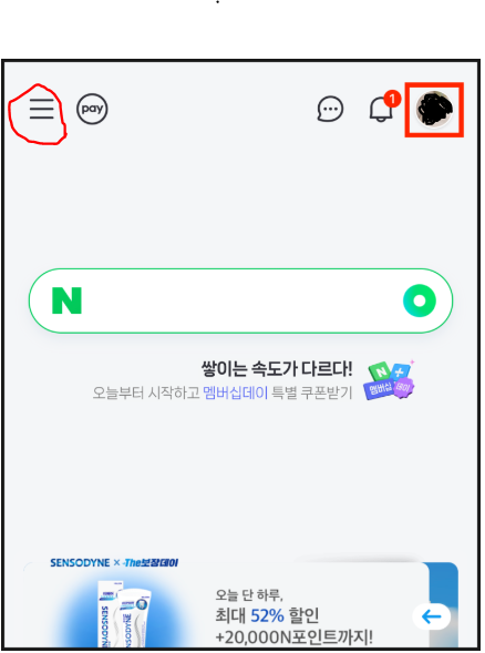 1. 네이버 접속한 후 우측상단 프로필 이미지 또는 좌측상단 검색을 클릭합니다.