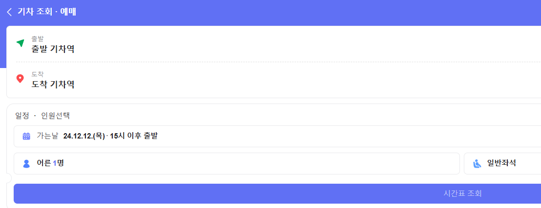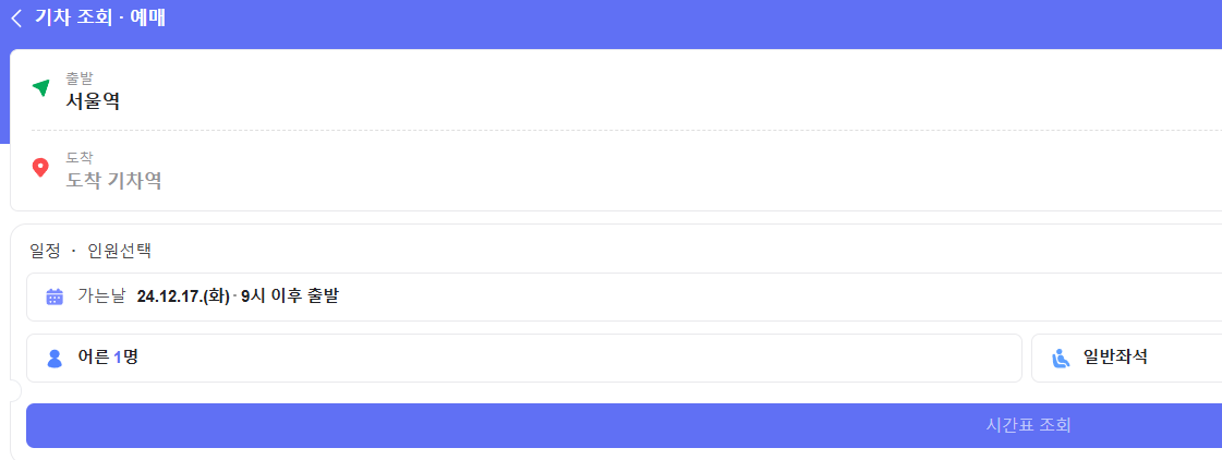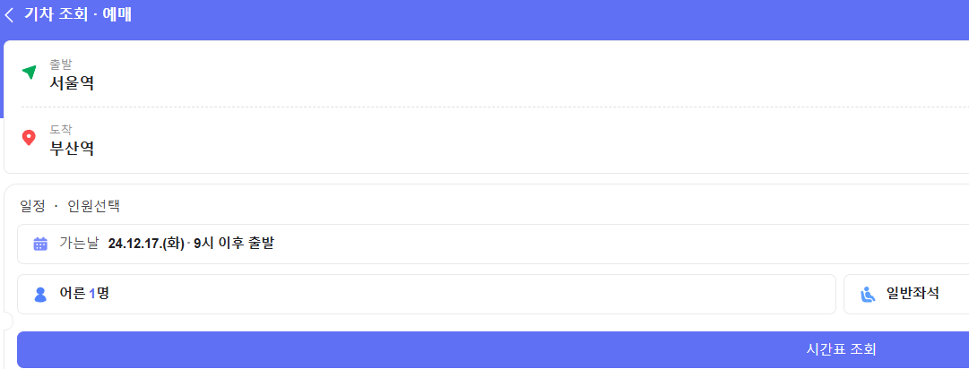 앞에서 입력한 출발지와 도착지, 가는날 그리고 인원수를 확인한 후 시간표 조회를 클릭합니다.