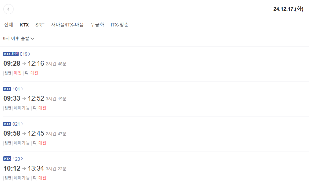 이용할 열차 종류를 선택하면 오름차순으로 예매가능한 열차를 확인할 수 있습니다.
