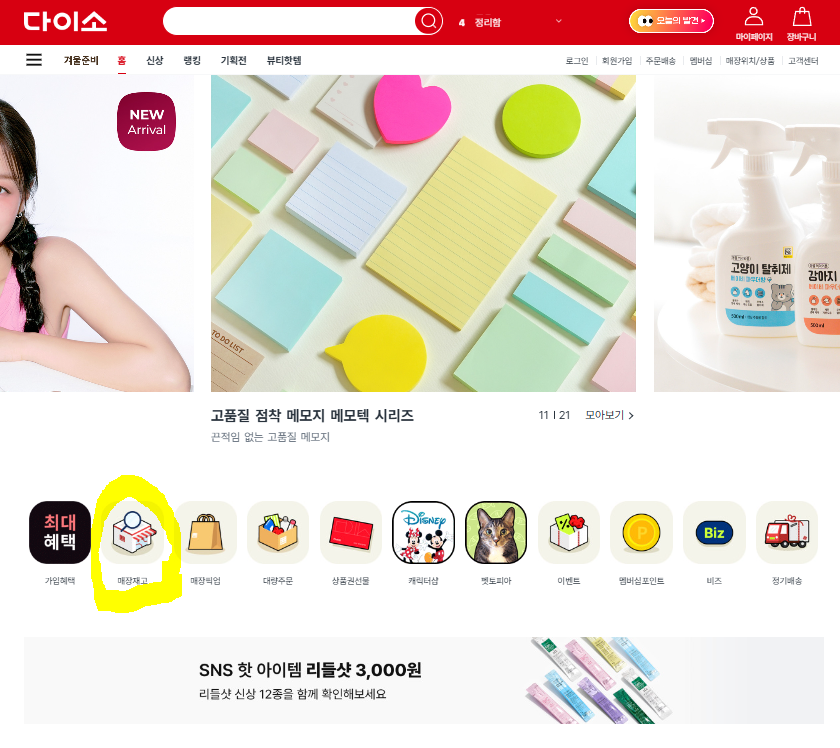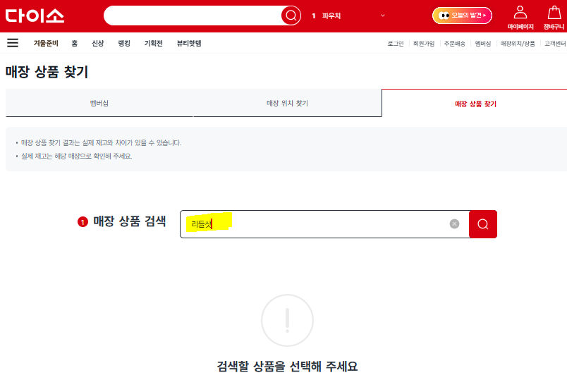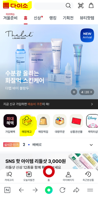 1. 핸드폰으로 다이소 제품을 재고조회하기 위해서는 특별히 다이소 앱을 다운받을 필요는 없습니다. 네이버 검색창에서 다이소를 입력하여 다이소 몰에 접속할 수 있으며, 앱에서 보기를 해제하시면 됩니다. 초기화면 중앙의 [매장재고]를 선택한 후 매장 상품 찾기에서 "리들샷"을 입력, 선택합니다