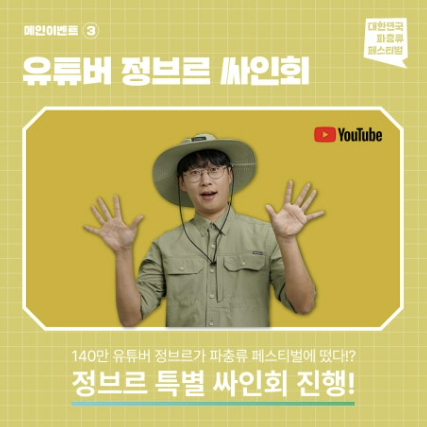 아이들에게 인기가 많은 유튜버 정브르를 초대하여 사인회를 진행합니다. 정브르는 140만 구독자를 보유한 인기 유튜버로 파충류 박람회 진행 중 선착순으로 싸인회를 진행한다고 합니다. 이색 애완동물 전문 94만 유튜버 다흑도 박람회 중 선착순 사인회를 진행합니다.