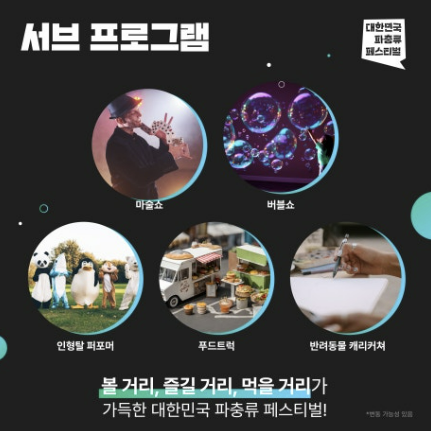 서브 이벤트로는 마술쇼, 버블쇼, 샌드아트, 동물인형탈, 반려동물 캐리커처 등의 프로그램이 준비되어 있습니다.