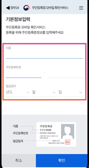 4. 주민등록정보입력( 실물 주민등록증의 발급일자, 주민등록번호)