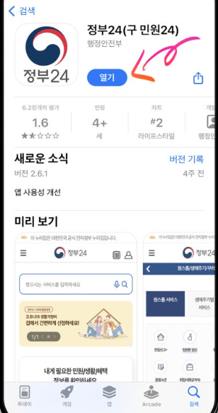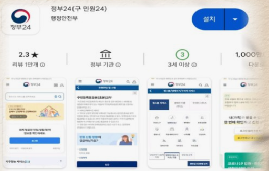 1. 스마트폰 앱 스토어 또는 플레이 스토어에 접속하여 정부24 앱을 다운로드 설치한 후 앱을 실행합니다.
