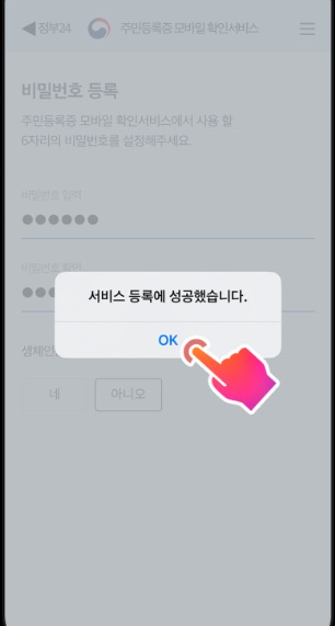 5. 주민등록 모바일 확인서비스에서 사용할 본인의 6자리 숫자 비밀번호를 입력한 후 생체인증 추가등록 여부에 맞게 버튼을 누릅니다. 곧 바로 다음 창에서 서비스 등록에 성공했다는 창이 나오며 OK버튼을 누르면 모바일 신분증이 발급 됩니다.