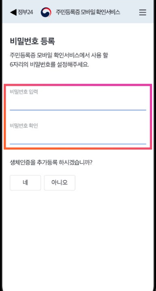 5. 비밀번호 설정 : 모바일 신분증 발급과 확인을 위한 6자리 비밀번호를 설정합니다.
