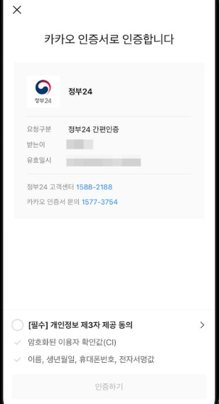 로그인을 위해 여러가지 방식 중 [간편인증. 모바일 신분증]을 통해 선호하는 카카오 인증서로 인증을 하였습니다.