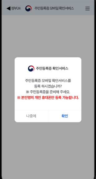 3. [주민등록 모바일 확인서비스] 접속한 후 본인명의 개인 휴대폰만 등록가능하다는 팝업에 확인 버튼을 누릅니다.