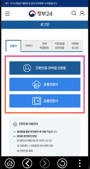 2. 정부24 앱 설치 및 로그인정부24 앱을 설치한 후 간편인증 방법으로 카카오톡, 네이버, 토스 등으로 간편하게 로그인 합니다.