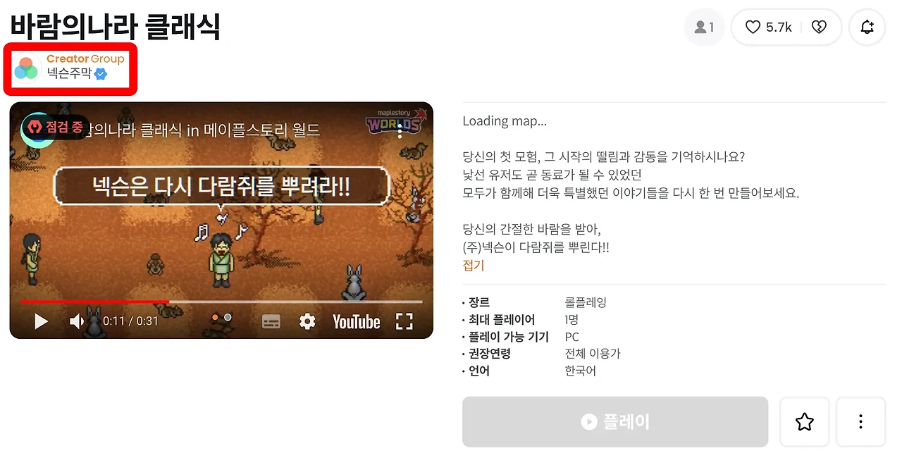- 메이플스토리 월드 웹사이트에 접속합니다. (https://maplestoryworlds.nexon.com/ko/play/b6afa5f1d19541f5a694974d2f12d0ad/)