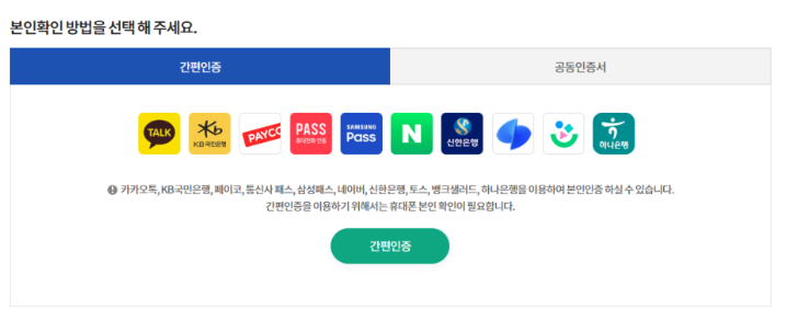 : 편하신 인증 서비스를 선택해 본인인증을 진행( 자주 사용하는 카카오톡 또는 네이버를 선택하면 간편하게 본인인증을 하실 수 있습니다.)