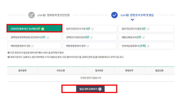 : 조회 후, 발급받기 버튼을 누르시고 인쇄를 하시면 보건증 인터넷발급 완료됩니다.