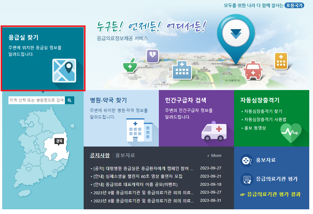 - E-GEN 응급의료포털 : E-GEN 포털을 통해 주변 응급실과 병원의 정보를 쉽게 찾을 수 있습니다. 주소를 입력하거나 현재 위치를 설정하면 가까운 병원 정보를 제공받을 수 있습니다.