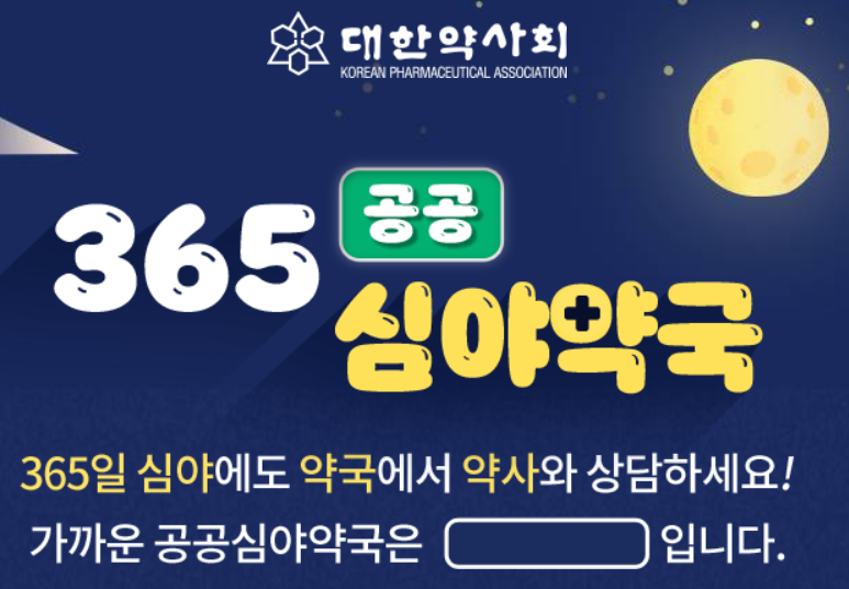 - 365 공공심야약국은 심야 시간에도 문을 여는 약국 정보를 제공하는 대한약사회 운영 플랫폼입니다.