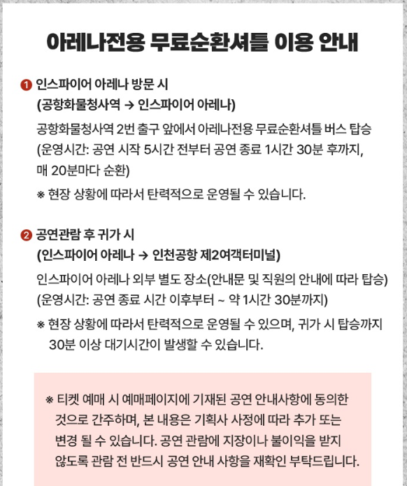 - 공연관람후귀가시 : (인스파이어 아레나 -> 인천공항 제2여객터미널) 인스파이어 아레나 외부 별도 장소(안내문 및 직원의 안내에 따라 탑승), (운영시간: 공연 종료 시간 이후부터 ~ 약1시간 30분까지) , 현장 상황에 따라서 탄력적으로 운영될 수 있으며, 귀가 시탑승까지 30분 이상 대기시간이 발생할 수 있습니다.