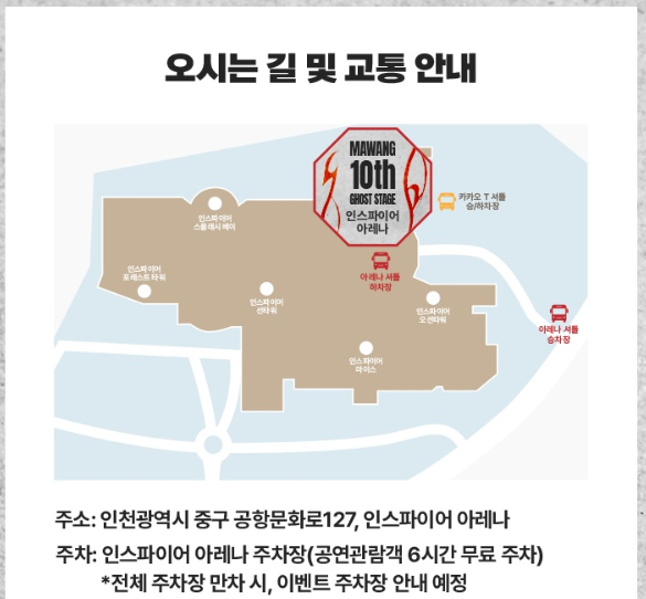 - 교통 : 인스파이어 아레나 방문 시, (공항화물청사역 ->인스파이어 아레나) 공항화물청사역 2번 출구 앞에서 아레나전용 무료순환셔틀버스 탑승 하시면 됩니다. (운영시간: 공연 시작 5시간 전부터 공연 종료 1시간 30분 후까지, 매20분마다 순환), 현장 상황에 따라서 탄력적으로 운영될 수 있습니다.