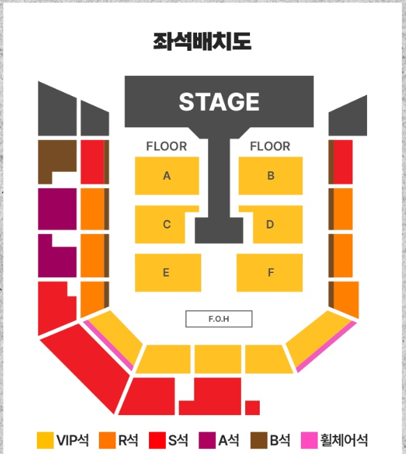 - FLOOR층은 단차가 없는 평지에 의자가 설치되며, 그외 구역은 계단식좌석이고, 일부 구역, 좌석은 난간 및 무대 시설물 또는 카메라 설치 등으로 인해 일부 시야 장애가 발생할 수 있습니다. 이로 인한 티켓 교환 및 환불은 불가합니다.