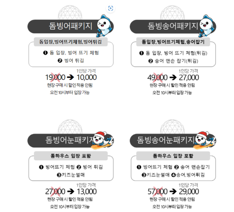 1. 돔빙어패키지 : 돔 입장 + 빙어뜨기체험 + 빙어튀김 => 19,000원