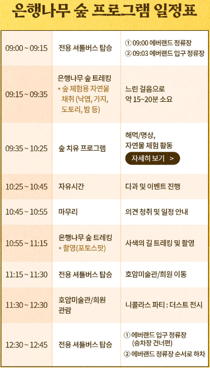 [전용 셔틀버스 탑승 => 은행나무숲 이동 => 은행나무숲 트레킹 => 숲치유 프로그램, 명상장 조경학 박사 스토리텔링 =>호암미술관 이동, ‘니콜라스 파티: 더스트’ 기획전을 감상 => 희원 관람 => 셔틀버스 탑승 후 복귀]