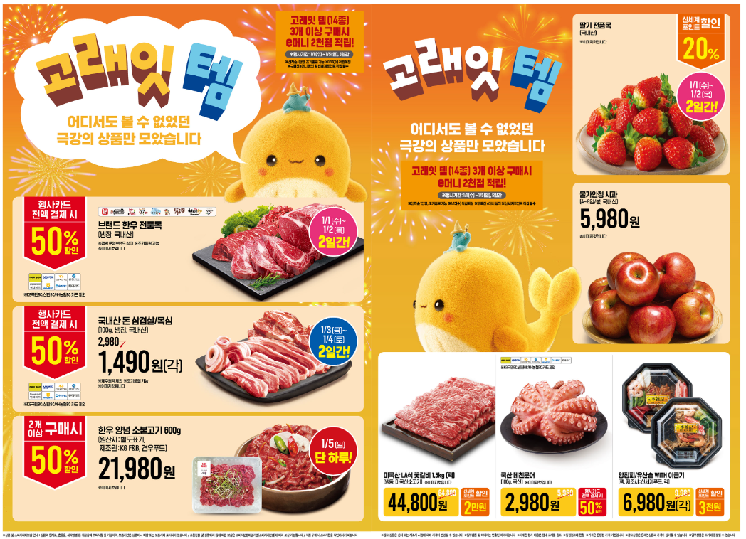 10. 50% 할인 (2개 이상 구매 시) : 고추장·된장·쌈장, 냉동 교자만두 11종, 국산두부, 냉장 우동 2인, 제로 탄산음료, 냉동 피자와 핫도그, 바디로션, 면도기·8입날, 핸드워시, 헤어염모제와 전동칫솔, 영양제, 퍼실·퍼울·피지·비트 세탁세제, 코디 베이지 소프트 화장지 등