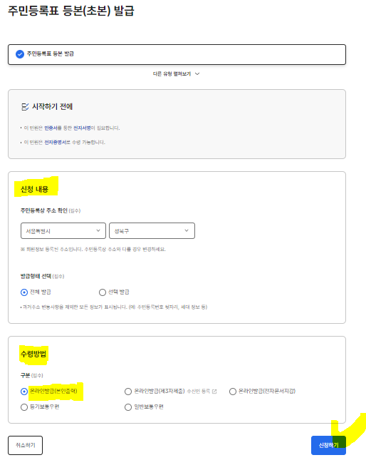 2) 다음화면에 보여지는 시작전 내용을 확인합니다. 신청내용의 본인거주 시와 구를 확인하고, 발급형태에서 전체발급 또는 선택발급을 필요에 맞에 선택합니다.