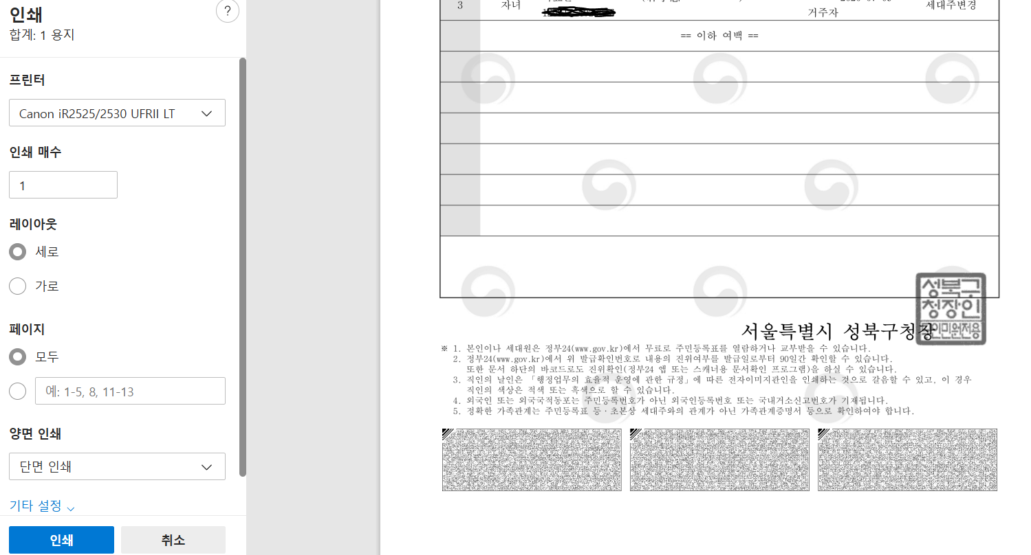 1) 문서처리상태에서 '처리완료' 밑의 [문서출력] 버튼을 누릅니다. 발급된 주민등록표가 보여지며, 인쇄 버튼을 누릅니다.