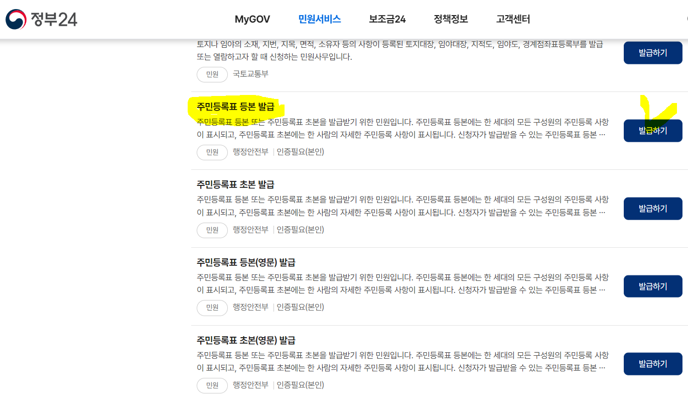 1) 로그인 완료 후 상단의 [민원서비스]를 클릭하면 하단 목록 중 [주민등록표 등본 발급] 항목의 우측 [발급하기] 버튼을 누릅니다.