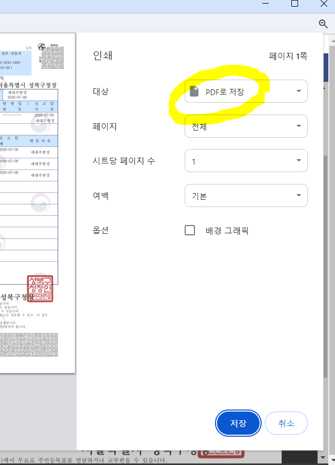 3) PDF파일의 저장 위치를 선택하고 프린트, 인쇄를 하면 최종 발급이 완료됩니다.