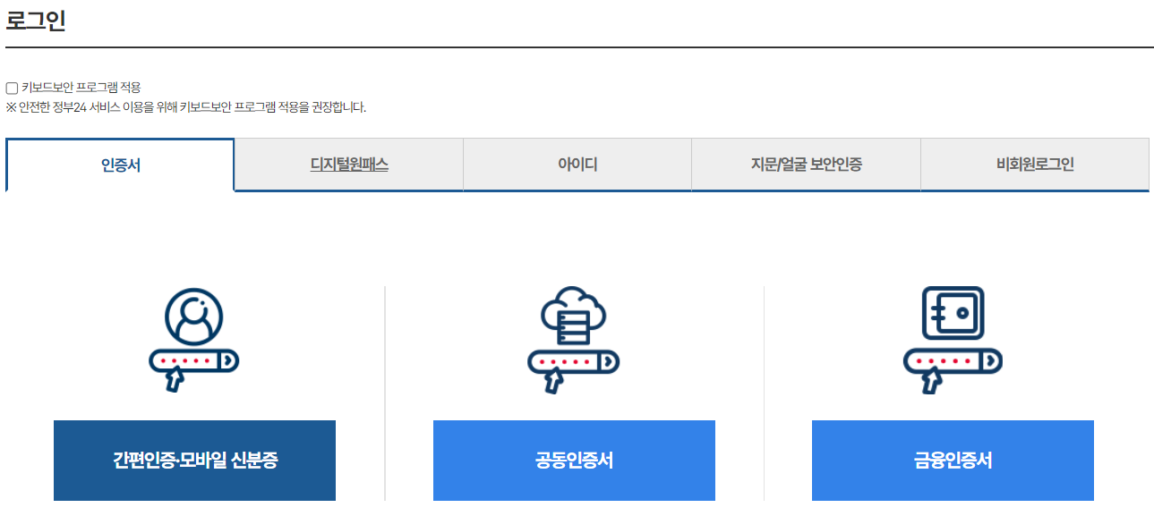 로그인을 위해서는 본인인증을 해야하며, 간편인증, 공동.금융인증 서 등을 이용하여 가능합니다.
