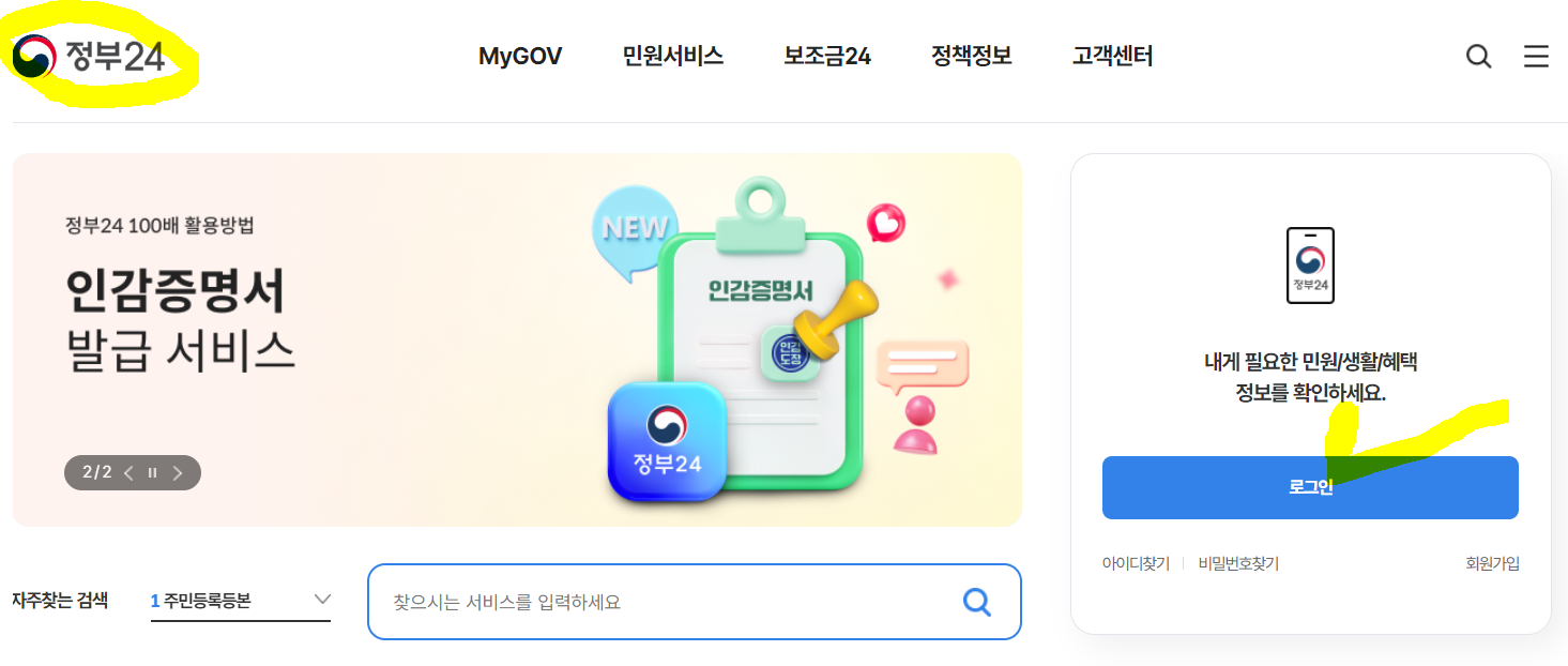정부24 초기화면 우측에 로그인 버튼을 클릭합니다.