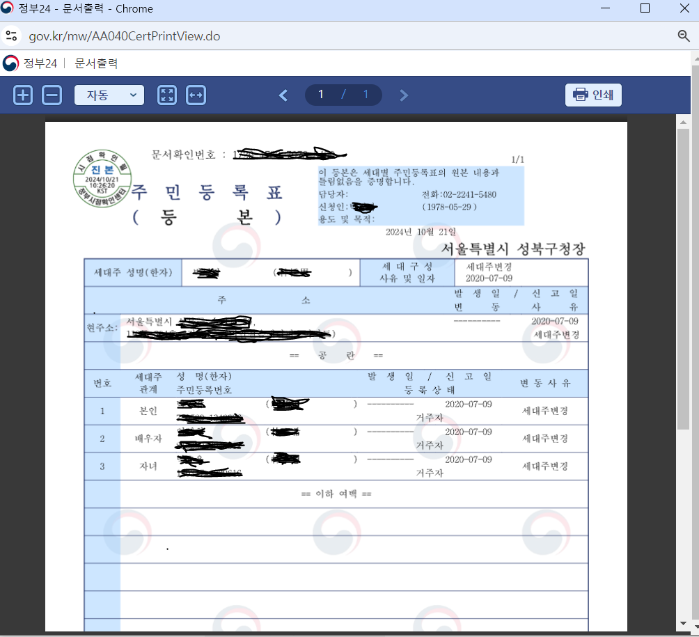 주민등록등본은 회사, 학교, 관공서 등에 제출해야되는 가장 많이 사용되는 서류입니다. 주민센터에 방문하지 않고, 인터넷으로 수수료없이 인터넷으로 쉽게 발급하시면 됩니다. 아래 예시를 통해 발급 할때마다 헷갈리지 않고 3분이내 간편하게 발급받으실 수 있습니다.