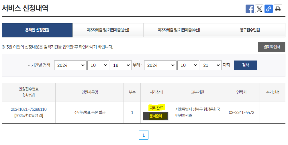 상기 수령방법 선택 후 신청하기 버튼을 누르면 주민등록 등본이 발급이 됩니다. 서비스 신청내역 항목에서 처리상태를 확인하면 '처리완료' 상태로 되어 있으면 발급이 된 상태입니다.