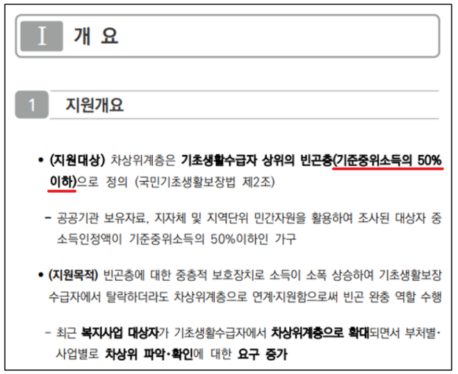 - 소득이 기준 중위소득의 50% 이하일 경우 차상위계층으로 인정받습니다.