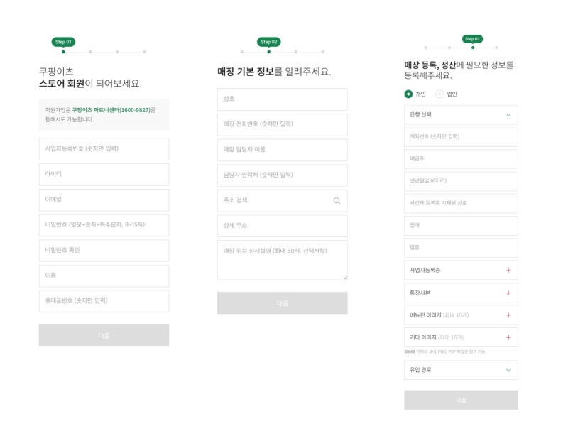 이제 본격적으로 쿠팡이츠 사장님사이트에 가입하는 방법을 알아보겠습니다. 가입 절차는 다음과 같이 진행됩니다.
