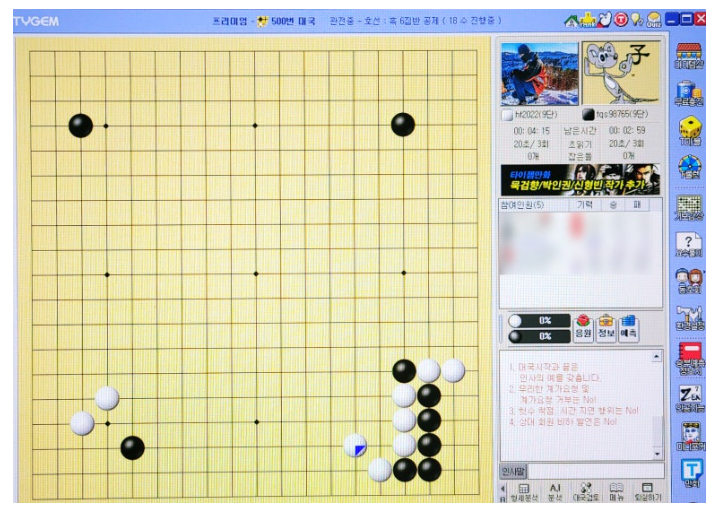 신청 후 대국이 매칭되면 바로 게임을 시작하면 됩니다. 게임이 끝나고 나면 "착수분석" 서비스를 통해 AI가 대국 내용을 자세히 분석해주므로, 실력 향상에 많은 도움이 될 것입니다.